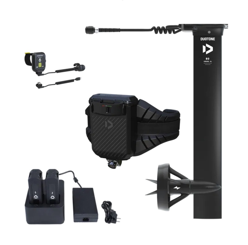 eHarness Set: Imbracatura tecnica leggera (~3,76 kg) con box impermeabile. Alloggia le batterie sul rider per mantenere la tavola leggera e idrodinamica. Sistema galleggiante con ricevitore integrato per una connessione segnale sempre stabile.