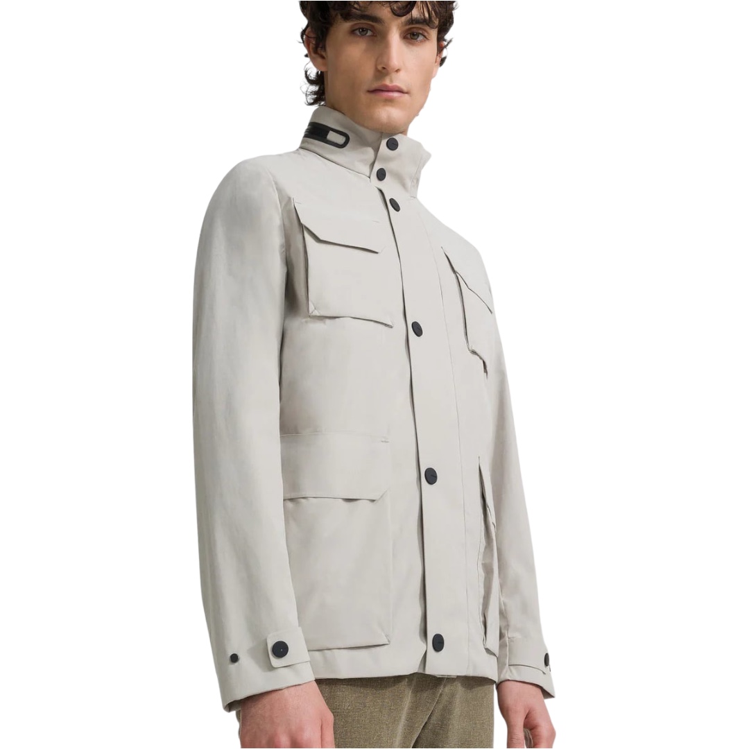 Dietro l’impeccabile taglio vintage, dal fit regolare, questa versione della field jacket da esploratore rivela una costruzione raffinata e gusto per la tecnologia. L’esterno del tessuto a membrana impermeabile e traspirante presenta un touch morbidissimo. Il davanti è caratterizzato dalle quattro tasche a soffietto applicate e chiuse da ampie pattine. La classica chiusura centrale a bottoni a pressione soft touch nasconde la zip termonastrata a doppio cursore.