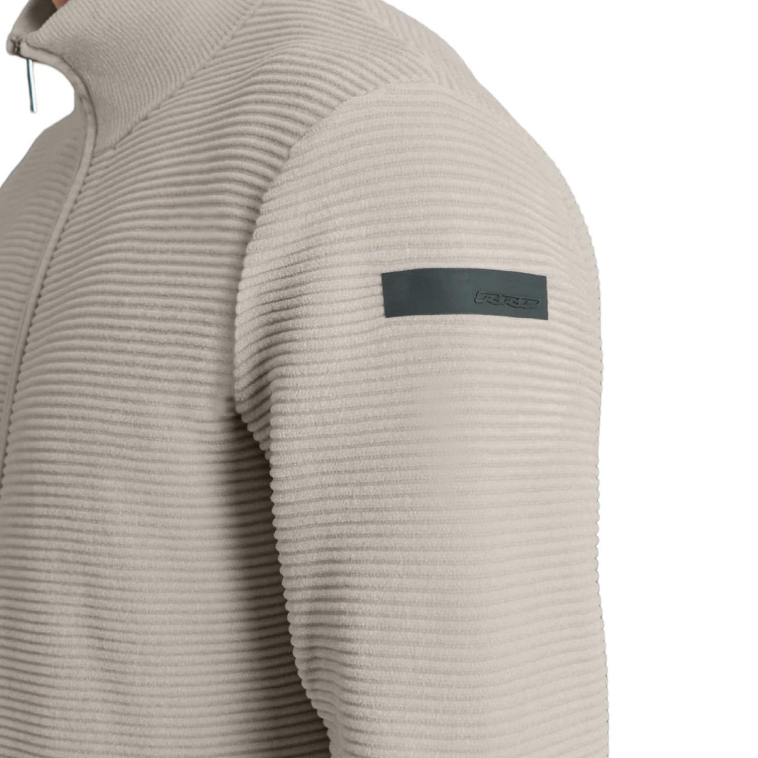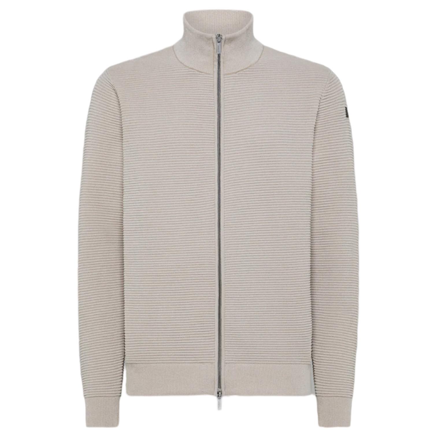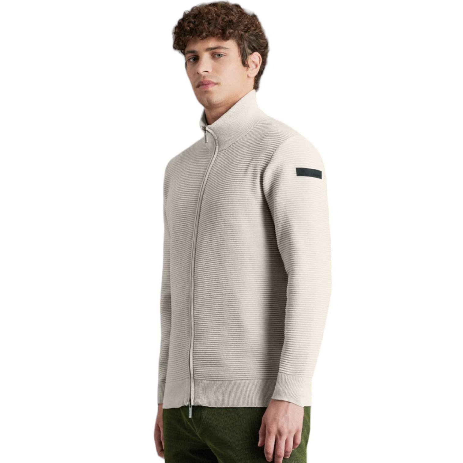 La preziosa lavorazione a effetto Ottoman conferisce un aspetto unico a questa maglia a collo alto e maniche lunghe dal fit regolare, in morbido e caldo tessuto dal touch vellutato. La tridimensionalità delle micro righe orizzontali è movimentata dalla zip integrale dotata di doppio cursore, che rende la maglia particolarmente versatile. Il collo, i polsini e il fondo sono rifiniti con coste sottili e creano un originale gioco di contrasto nelle tenui nuance di stagione, contrappuntate dal logo a microiniezione nero sulla manica sinistra. Il modello è particolarmente adatto per un outfit casual completando un chino informale, o un pantalone cargo.