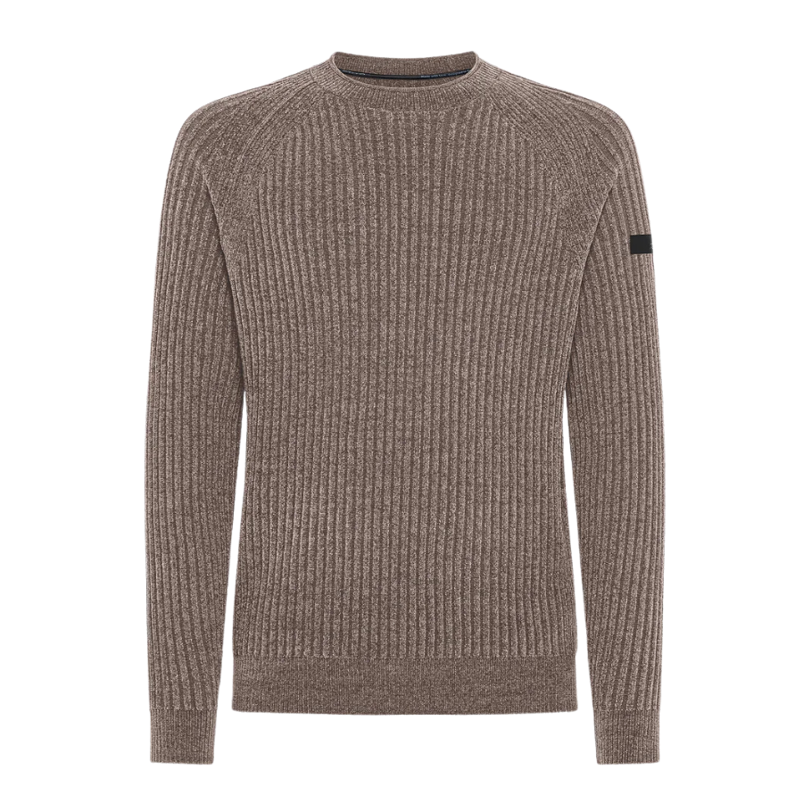 La maglia monocromatica si distingue per l’elegante lavorazione ad ampie coste inglesi, che conferisce al capo una struttura visivamente sofisticata, pur mantenendo una sorprendente leggerezza e un comfort naturale. Il tessuto stretch, caldo e delicato al tatto, accompagna ogni movimento con fluidità, valorizzato dal taglio raglan delle maniche. Il fit regolare è definito da dettagli discreti e ricercati, come il girocollo risvoltato e le finiture elasticizzate su fondo e polsi.