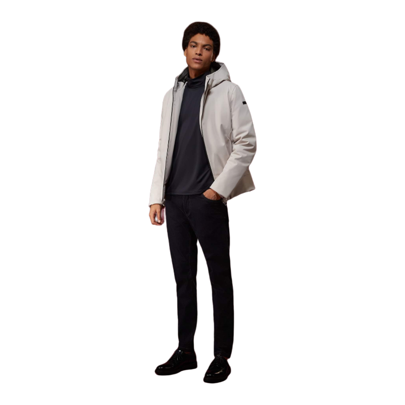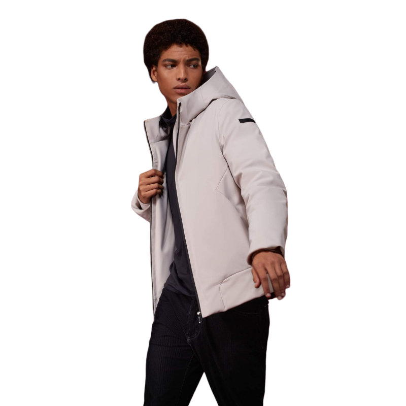 Questo capo è stato realizzato con un tessuto progettato utilizzando il metodo esclusivo RRD “Holystic Technology 3” che garantisce funzionalità, stile e unicità del prodotto grazie a tre componenti che, uniti insieme, ne costituiscono la struttura: lo shell in poliammide/Lycra® super matt (165g/m2 – 80% polyamide e 20% elastane) viene unito a una membrana poliuretanica elastica, traspirante, anti acqua e anti vento capace di assicurare una resistenza di 5.000 mm di colonna d’acqua. Nella parte interna, un pile elasticizzato garantisce termicità e facilità di movimento. Il suo aspetto “pulito” e senza pieghe è accentuato da zips termosaldate e nessuna cucitura esterna. Internamente cela super elasticità: puo’ adattarsi a qualsiasi tipo di abbigliamento esaltando la linea del corpo e la libertà dei movimenti. L’imbottitura in piuma d’anatra 90/10, inserita all’interno di un tessuto in nylon tubolare senza cuciture, non consente alle piume di fuoriuscire.