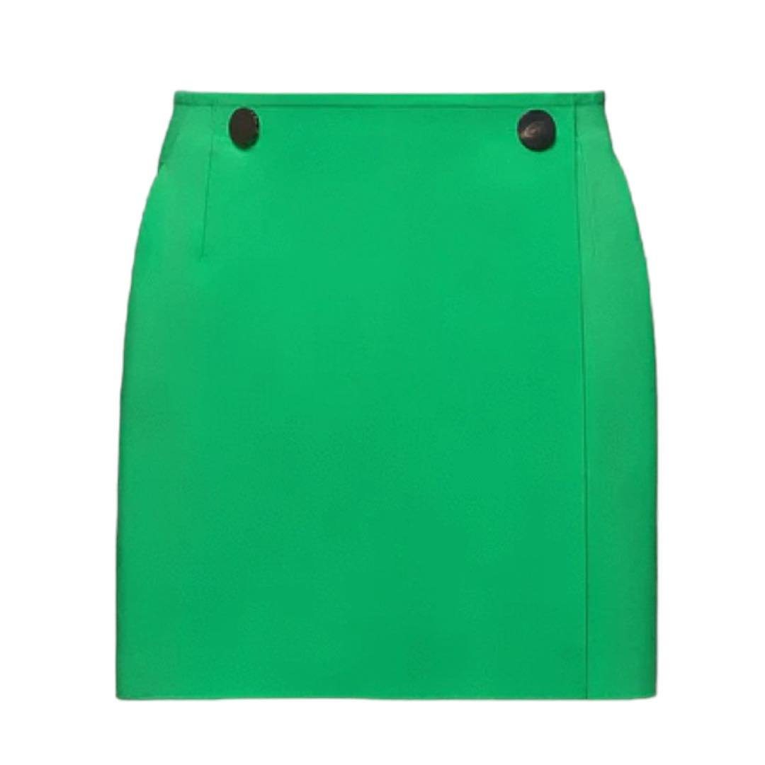 Il taglio essenziale della mini gonna a portafoglio mostra tutta la sua anima elegante.