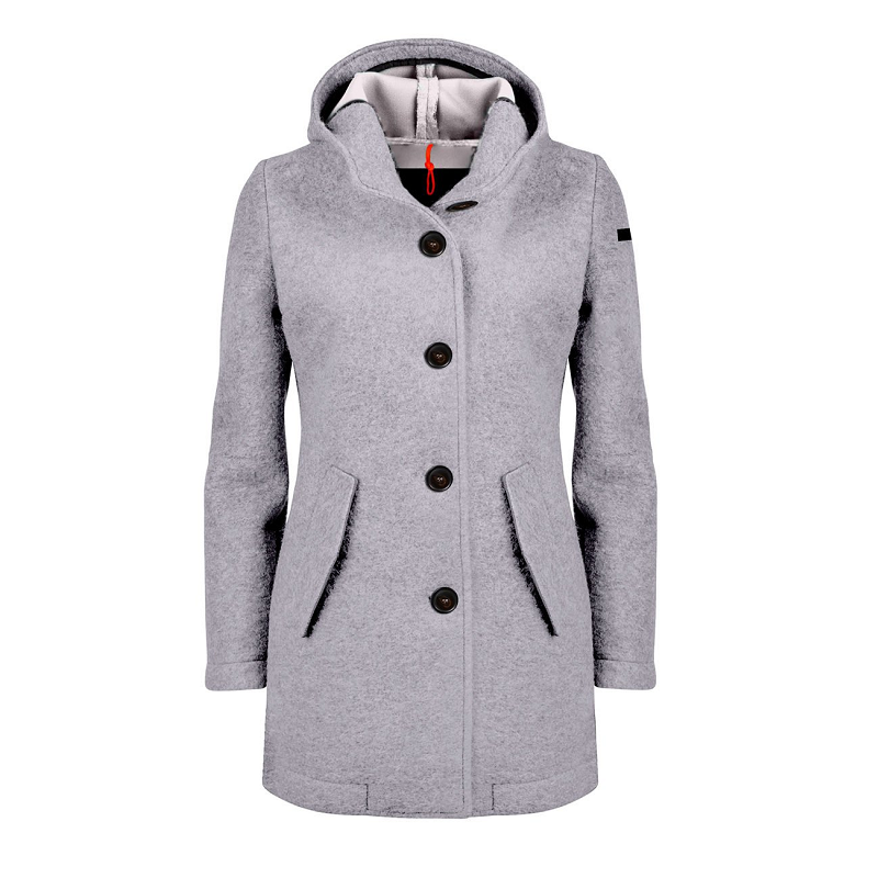 Giacca lunghezza tre quarti con cappuccio e cinque bottoni.