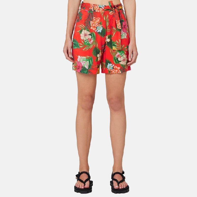 Shorts a vita alta con passanti di manifattura italiana in leggera viscosa. Stampa hawaiana.